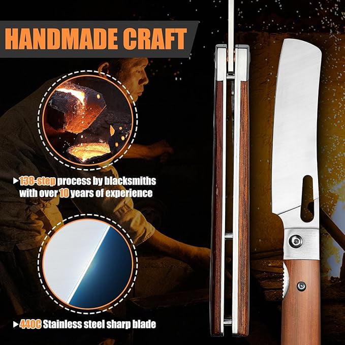 HANDMADE CRAFT:Each folding knife is handcrafted using a 138-step process including heat treatment, forging, cooling, shaping,and hand-polished and so on by blacksmiths with over 10 years of experience. This means sharper blades and durability, so our chef's knives stand the test of time.