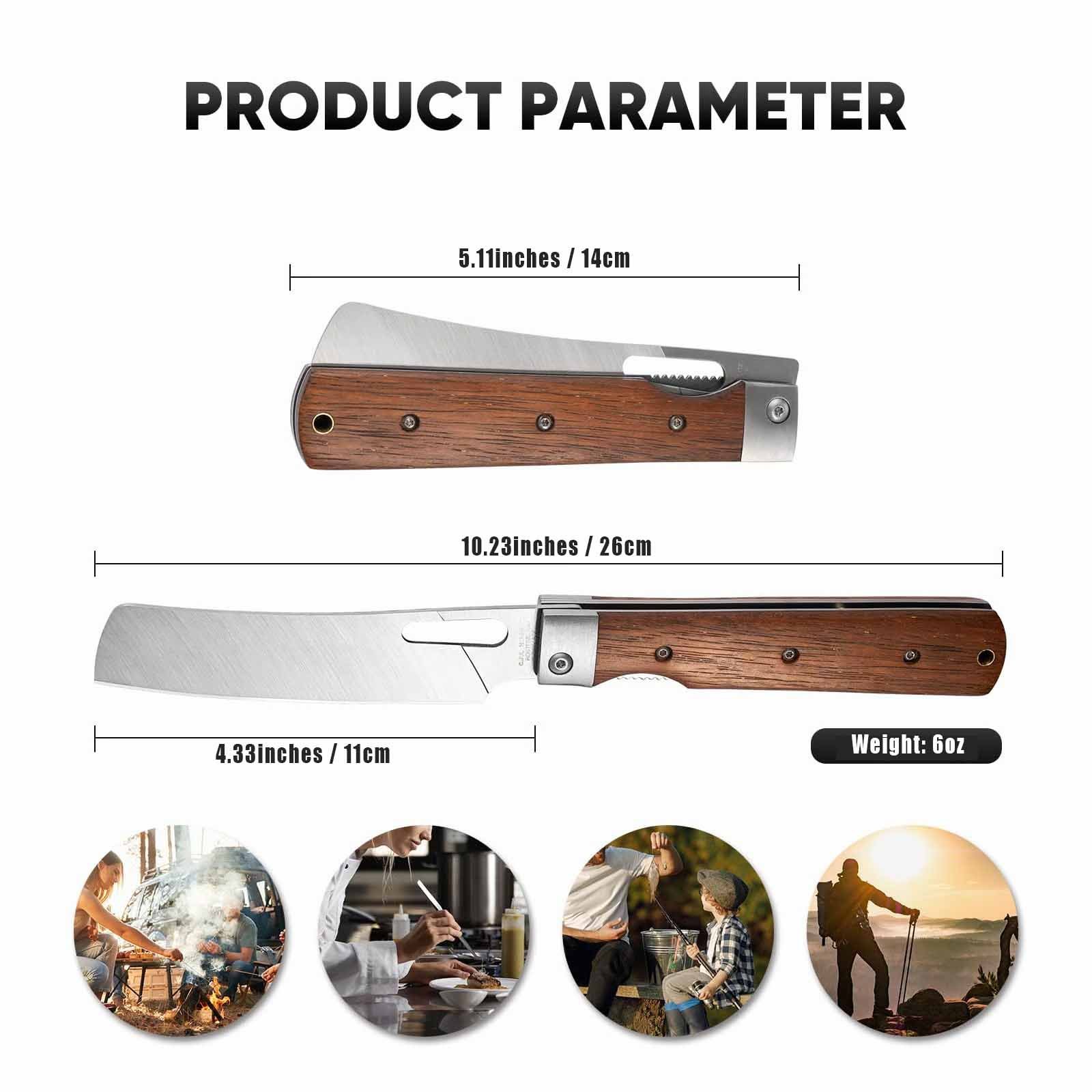 UNIQUE MATERIALS and DESIGN:Folding Nakiri Knife is made of high-quality 440C stainless steel with ultra-sharp chef blade and wear resistance performance. Nakiri knives are designed for straight up and down chopping for precise, clean cuts. It makes quick work of cutting through onions, ginger, and other vegetables.The blade is safely held in place by the liner lock which keeps your fingers safe while the knife is in use.