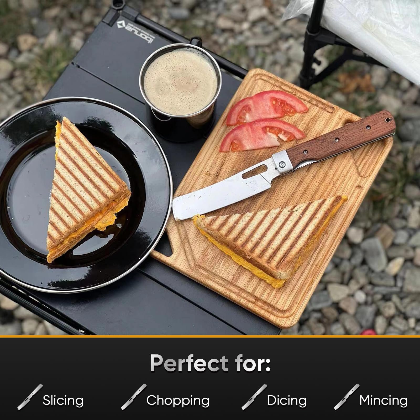 VERSATILITY and PORTABILITY: Smaller in size and folding design for greater portability. Its suitable length is convenient to be used not only in the kitchen, but also in BBQ, camping outdoor, and other scenarios. And this travel Knife's versatility is not limited to meat! Its versatile design makes it ideal for slicing a wide variety of foods such as tomatoes, fruits and vegetables.
